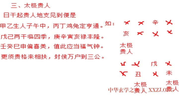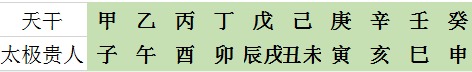 例如生日是天干是甲或者乙的人,刚好是属鼠或者属马的,那么就有太极贵人。需要注意的是“戊己两干临四季”中的“四季”是指四季之末,四 季之土,即辰、戌、丑、未。