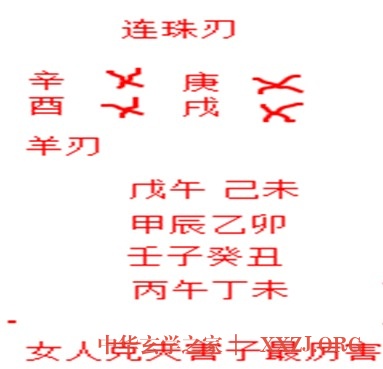 在四柱当中,有两个柱,它们天干地支都是挨着的,这就叫连珠刃。比如丙午、丁未两柱,还有比如,戊午和己未,或者壬子、癸丑,或者甲辰、乙卯等等。比如,年柱是辛酉,日柱是庚戌,庚禄在申,酉为羊刃,酉为庚的羊刃,庚辛是连着的,酉戌是相边的,这就叫连珠刃。柱中有连珠刃是一个大凶的格局,男人有就会不得善终,不得好死。