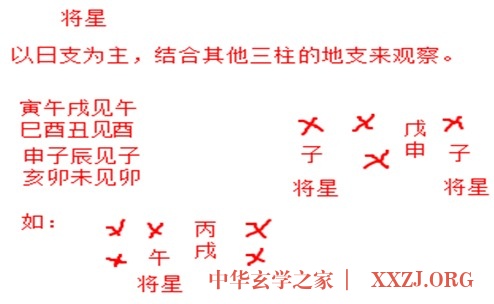 找将星,以日支为主,结合其他三柱的地支来观察。如果地支是寅午戌三个当中的一个,在其它三柱见到午的,就为将星。其它以此类推。比如,日柱为丙戌,月支为午,则月支午为日干的将星。再如,戊申日柱,年支为子,时支为子,则年支为将星,时柱也为将星。也就是说,你记住了三合局,以日支为准,其它三柱地支见到了三合局中间的那个字,就为将星。三合局,第一个为合成这个五行的长生的位置,中间一个字为合成这个五行的旺位,末尾一个字为合成这个五行的墓位。将星,是一个福星,是一个文武双全,能领导能力的人。
