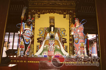 道教早期并不供奉神像,后来为了便于传播,才开始塑造神像供奉。最早的道教神像据说是北魏寇谦之主持塑造的,北宋真宗时道教造像才全面普及开。大型道教宫观中, “天尊殿”(或曰“三清阁”)以及“四御殿”必不可少,至于其他神仙,则根据道观之历史、地理特点而不尽相同。将“三清”合祀在一起,大概伊始于宋初。 “三清殿”中,三个苍颜白发、和颜悦色的老人正襟危坐在神坛上,其中“元始天尊”(玉清大帝)居于中间,他左手虚捻,右手虚捧(有的造像则是手持混元宝珠),象征宇宙混沌、阴阳未判的“洪元”纪;“灵宝天尊”(上清大帝)居左,或执太极图,或持如意,象征混沌始判、阴阳分明的“混元”纪;“道德天尊” (太清大帝)居右,手执太极扇,象征阴静阳动、万物生长的“太初”纪。有的地方还单独建有老君神像,一般是盘腿而坐,右手倚几、左手抚膝,两眼平视,双耳垂肩,长髯飘洒在前胸。