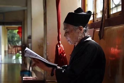 此时楼上传来了道友们的诵经声,我们顺着声音走到二楼,二楼才是道院平日进行宗教活动的地方。窄窄的楼道上是一个窄窄的殿堂,大殿里供奉着三清祖师,一众道友已经换上经衣开始为师太诵经礼拜。